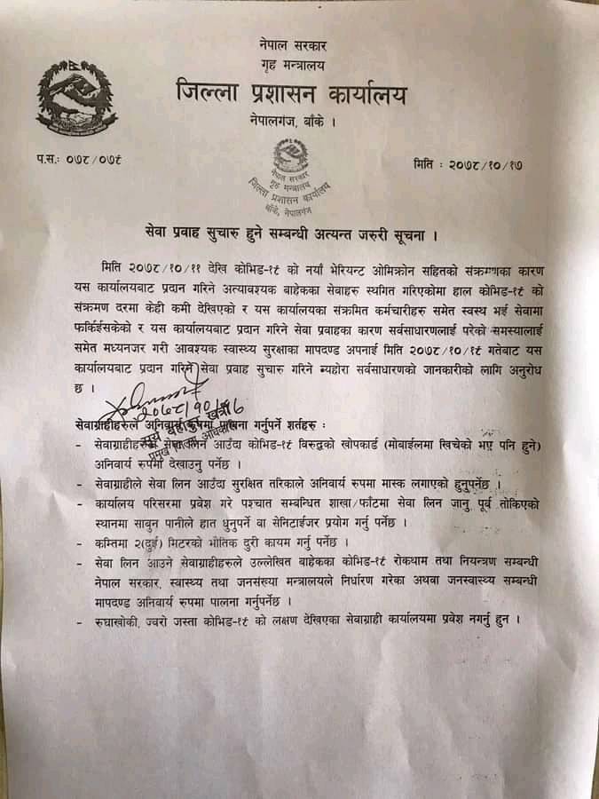 नेपालगञ्ज । कोरोना संक्रमणका कारण स्थगित गरिएको जिल्ला प्रशासन कार्यालय बाँकेबाट प्रदान हुने सेवा १९ गतेबाट संचालन हुने भएको छ ।