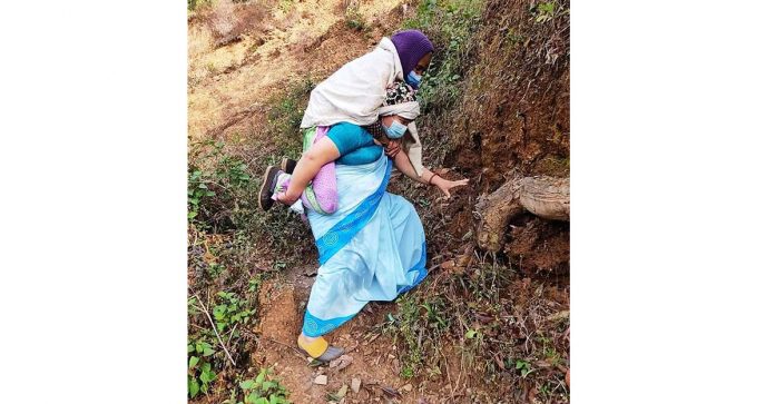 गुल्मीको गुल्मी दरबार गाउँपालिका वडा नम्बर ३ मा कार्यरत सामुदायिक महिला स्वास्थ्य स्वयंमसेविका लीला थापाले गाउँकै वृद्धा देवकली टन्डनलाई बोकेर खोप केन्द्र लग्नुभएको हो ।