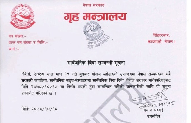 गृह मन्त्रालयले सूचना निकालेर १९ गते नेपालभर सरकारी कार्यालय, सार्वजनिक सङ्घसंस्था बन्द रहने जानकारी दिएको छ ।