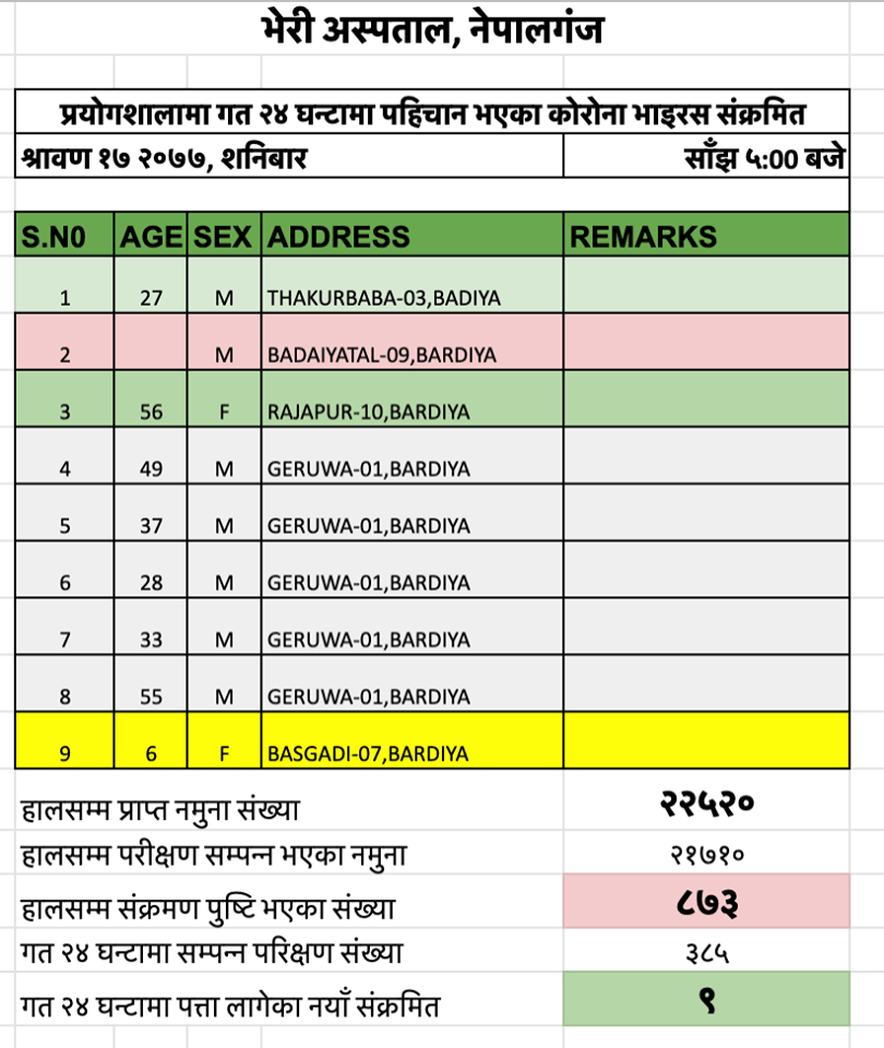 त्यस्तै राजापुर नगरपालिका ६५ वर्षीया महिला र बाँसगढीका नगरपालिकाका ६ वर्षीया बालिकामा कोरोना देखिएको भेरी अस्पतालले जारी गरेको सूचनामा उल्लेख छ ।