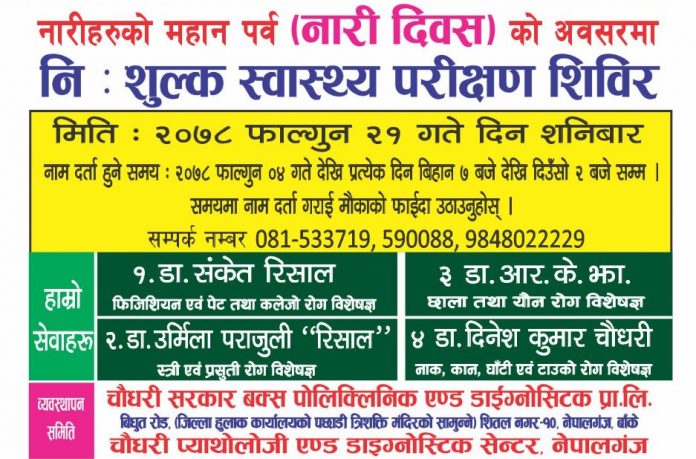 ज्ञान, दामोदर स्मृति प्रतिष्ठान तथा चौधरी हरदत्त एवं सरकार बक्स स्मृति प्रतिष्ठानको आयोजनामा चौधरी सरकार बक्स पोलिक्लिनिक एण्ड डाइग्नोस्टिक प्रालि नेपालगंज–१०, शितल नगर फागुन २१ गते शनिबार उक्त शिबिर संचालन हुन लागेको हो ।