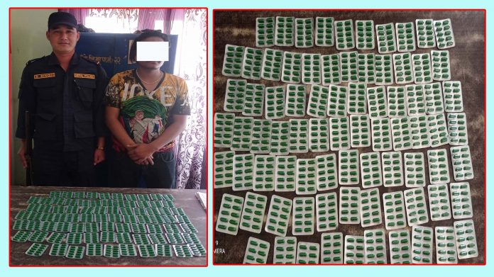 प्रहरी कार्यालयका प्रमुख मिन बहादुर बिष्टको नेतृत्वमा खटिएको प्रहरी टोलीले कम्मरमा पेटी बाँधेर लागु औषध मानिएको ट्रमाडोल क्याप औषधी ८० फाईलसहित दांग तुलसीपुर उपमहानगरपालिका वडा नं १८ का २२ वर्षीय बिकास बिकलाई पक्राउ गरेको जनाएको छ ।