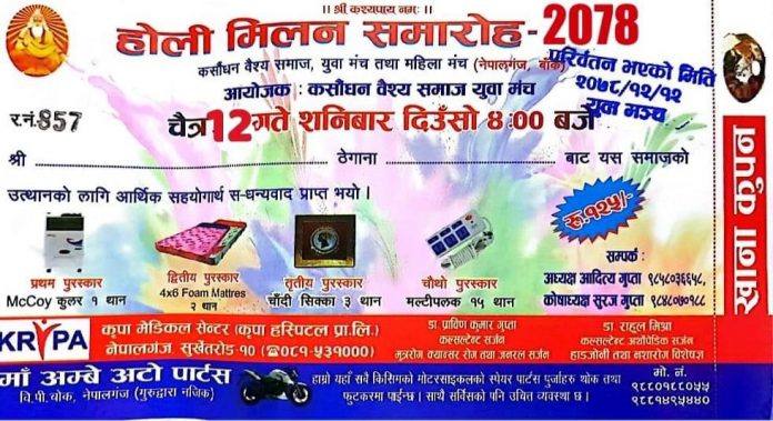 नेपालगञ्ज । नेपालगञ्जमा यही चैत्र १२ गते भब्य होली मिलन समारोह २०७८ आयोजना गरिएको छ । कसौधन बैश्य समाज युवा मंचको आयोजनामा होलीको अवसरमा भब्य होली मिलन समारोह २०७८ आयोजना गरिएको हो ।