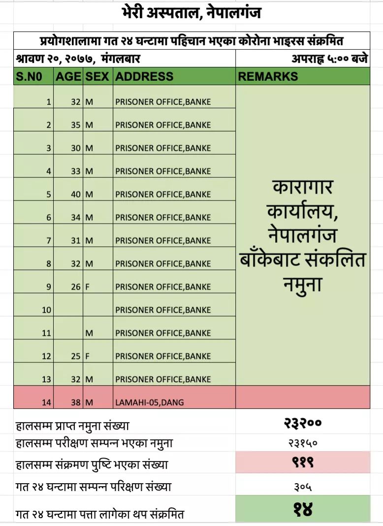 भेरी अस्पताल नेपालगन्जमा गत २४ घण्टामा भएकाे परीक्षणमा नेपालगन्ज कारागारका १३ जनामा काेराेना संक्रमण पुष्टि भएकाे हाे ।