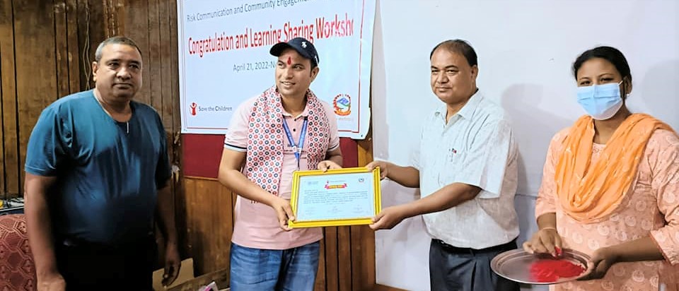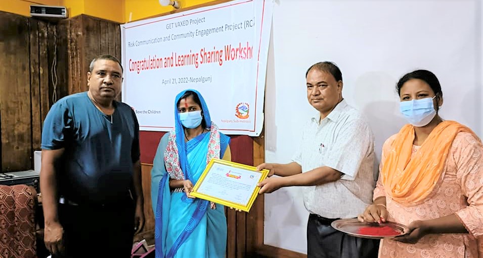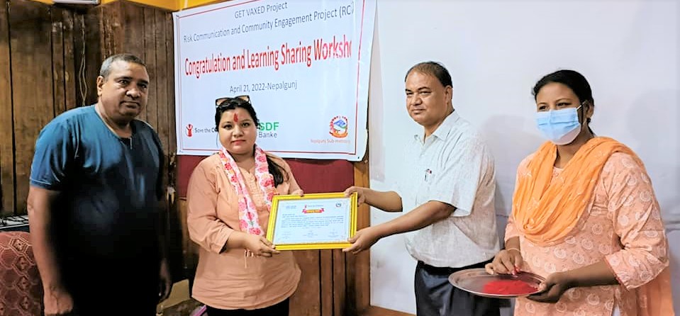 परियोजनाको समयावधी छोटो समयमा कोरोना बिरुद्धको लडाईमा धेरै व्यक्तिलाई बुझाउने कार्यमा सहयोग गर्ने नेपालगञ्जका स्वास्थ्य संस्थाका स्वास्थ्यकर्मी, महिला स्वास्थ्य स्वयंसेविका, युवा क्लबका पदाधिकारी, किशोरी क्लबका पदाधिकारी र फिल्डमा खटिएका स्वयंसेवकलाई प्रमाणपत्रले सधन्यवाद सहित सम्मान प्रदान गरिएको परियोजनाका सिनियर फिल्ड अधिकृत सहजराम यादवले जानकारी दिनुभयो ।