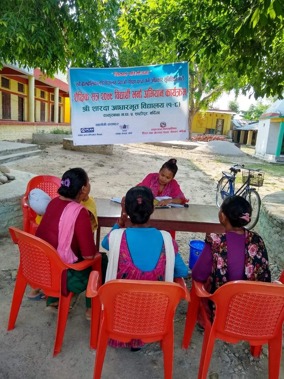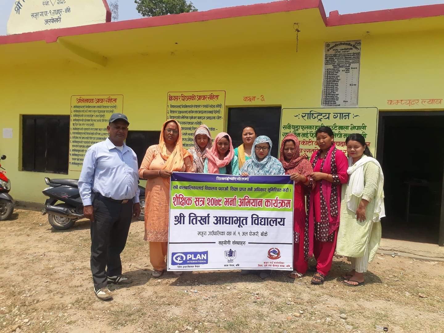 विद्यालय व्यवस्थापन समितिको बैठकबाट नै निर्णय गराई कार्यतालिकासहित विद्यार्थी भर्ना कार्यक्रम २०७९ बैशाख महिनामा नै सञ्चालन गर्ने, भर्ना हुन आउने बालबालिकालाई तत्काल भर्ना गरी स्वागत गने र निःशुल्क पाठ्यपुस्तक उपलब्ध गराउने, विद्यार्थी भर्नाका लागि आफ्नो सेवाक्षेत्रभित्र व्यापक रुपमा प्रचार प्रसार र सूचना गर्ने सूचनामा उल्लेख भए बमोजिम सबै बालबालिकालाई विद्यालय पठाऔं, शिक्षा प्राप्त गर्ने अधिकार सुनिश्चित गरौं’ भन्ने नाराका साथ प्लान इन्टरनेशनल नेपाल तथा सामाजिक सचेतन सरोकार मंच स्याक नेपाल बाँकेको साझेदारिमा संचालित बाँके र बर्दिया जिल्लामा परियोजना संचालन भएका २५ बिधालयहरुमा शैक्षिक सत्र २०७९ भर्ना अभियान कार्यक्रम संचालन गरिएको परियोजना प्रमुख लक्ष्मी प्रसाद शर्माले जानकारी दिनुभयाे ।