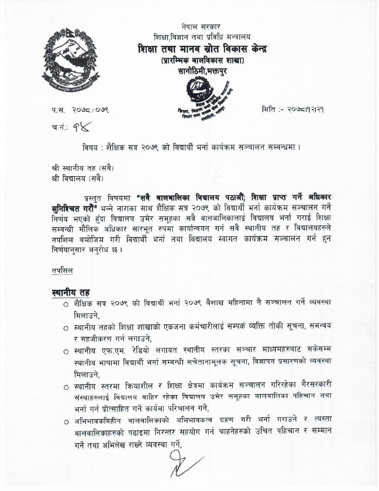 भर्ना अभियानका कारण विद्यालयमा भर्ना भएका बालबालिकाको उमेरगत विवरणसहितको प्रतिवेदन सम्बन्धित शिक्षा विकास तथा समन्वय इकाईमा पठाउने, आफ्नो क्षेत्र भित्र विद्यालय उमेरका शतप्रतिशत बालबालिका समयमै विद्यालय भर्ना गराई भर्ना सकिए लगत्तै विद्यालयबाहिर बालबालिका नभएको स्वघोषणा गर्नुपर्ने सूचनामा उल्लेख गरिएको छ ।
