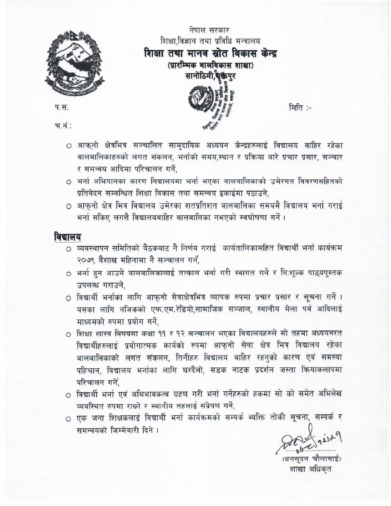 गुलरिया । नेपाल सरकार शिक्षा बिज्ञान तथा प्रबिधि मन्त्रालय शिक्षा तथा मानव स्रोत बिकास केन्द्र सानोठीमी भक्तपुरको पत्र संख्या २०७८ ७९ को चलानी नं १४ को सूचनामा, ‘स्थानीय स्तरमा क्रियाशील र शिक्षा क्षेत्रमा कार्यक्रम सञ्चालन गरिरहेका गैरसरकारी संस्थाहरुलाई विद्यालय बाहिर रहेका विद्यालय उमेर समूहका बालबालिका पहिचान तथा भर्ना गर्न प्रोत्साहित गर्ने कार्यमा परिचालन गर्ने’ उल्लेख गरिएको छ ।