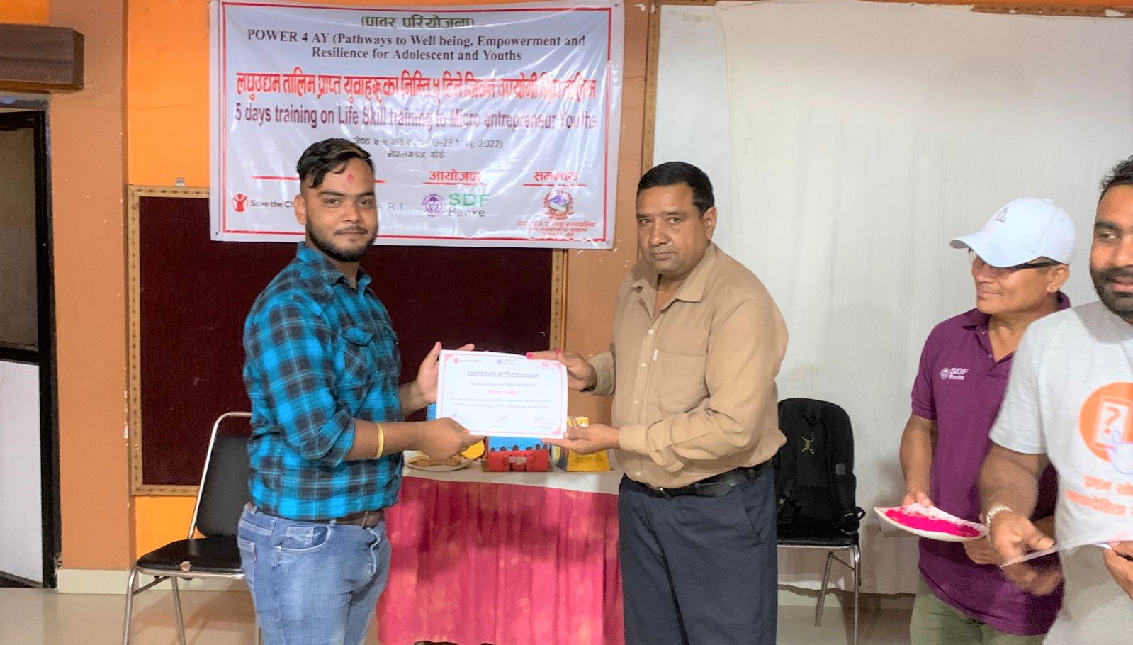 एसडिएफका अध्यक्ष चम्प सिंह थापामगरको अध्यक्षतामा भएको समापन कार्यक्रममा सस्थाका संस्थापक अध्यक्ष घनश्याम उपाध्याय समेतले प्रमाण पत्र बितरण गर्नुभएको थियो ।