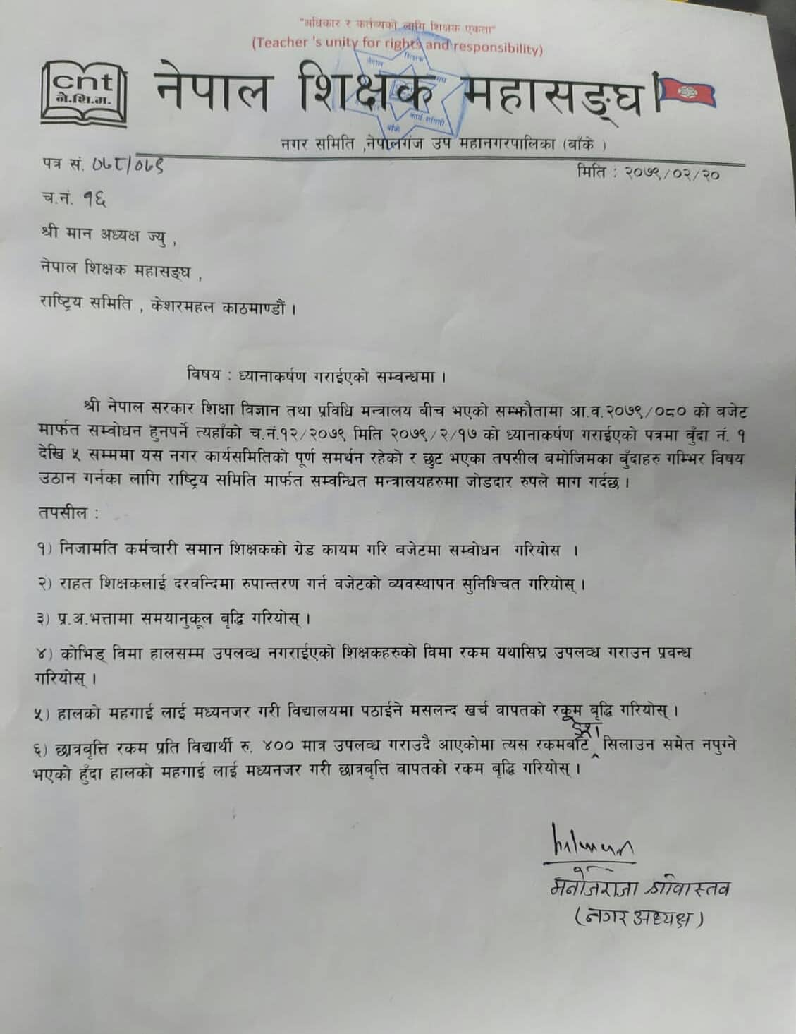 महासंघ नगरसमिति नेपालगञ्जले राष्ट्रिय महासंघले मन्त्रालयलाई बुझाएको ध्यानाकर्षण पत्रमा १ देखि ५ नम्बर बुँदासम्मको मागप्रति समर्थन रहेको भन्दै छुटेको मागहरुप्रति ध्यानाकर्षण गराएको हो ।
