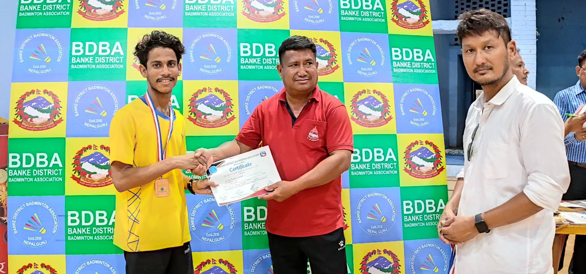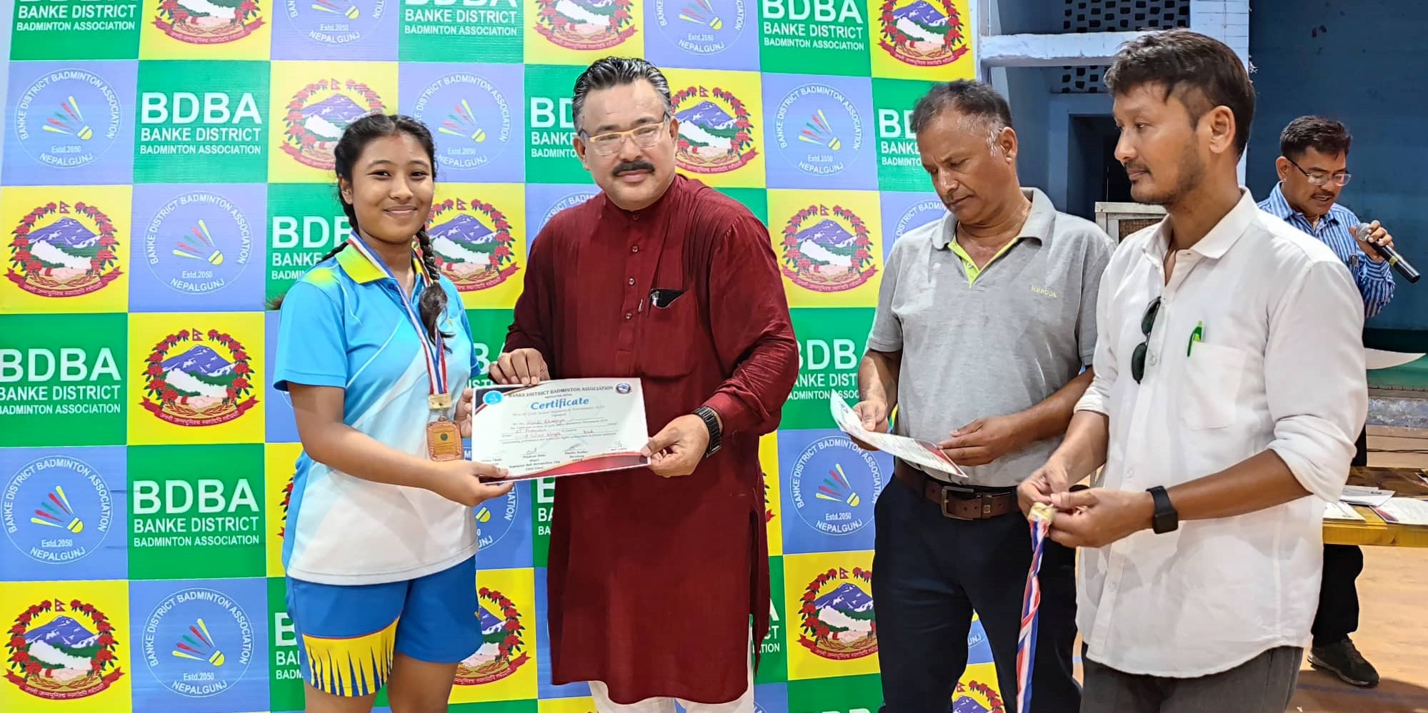 बिजयी खेलाडीहरुलाई नेपालगञ्जका मेयर प्रशान्त बिष्ट, मध्यपश्चिम क्षेत्रीय खेलुकद बिकास समितिका कार्यालय प्रमुख महेश चन्द, बाँके जिल्ला ब्याटमिन्टन संघका अध्यक्ष संजय थापा, उपाध्यक्ष मिन बहादुर मल्ल, सचिव भक्त गोद्धार, प्रतियोगिता संयोजक अनिल लाखे, नेपालगञ्ज उद्योग वाणिज्य संघका पुर्व अध्यक्ष कृष्ण प्रसाद श्रेष्ठ लगायतले मेडल तथा प्रमाणपत्र बितरण गर्नुभएको थियो ।