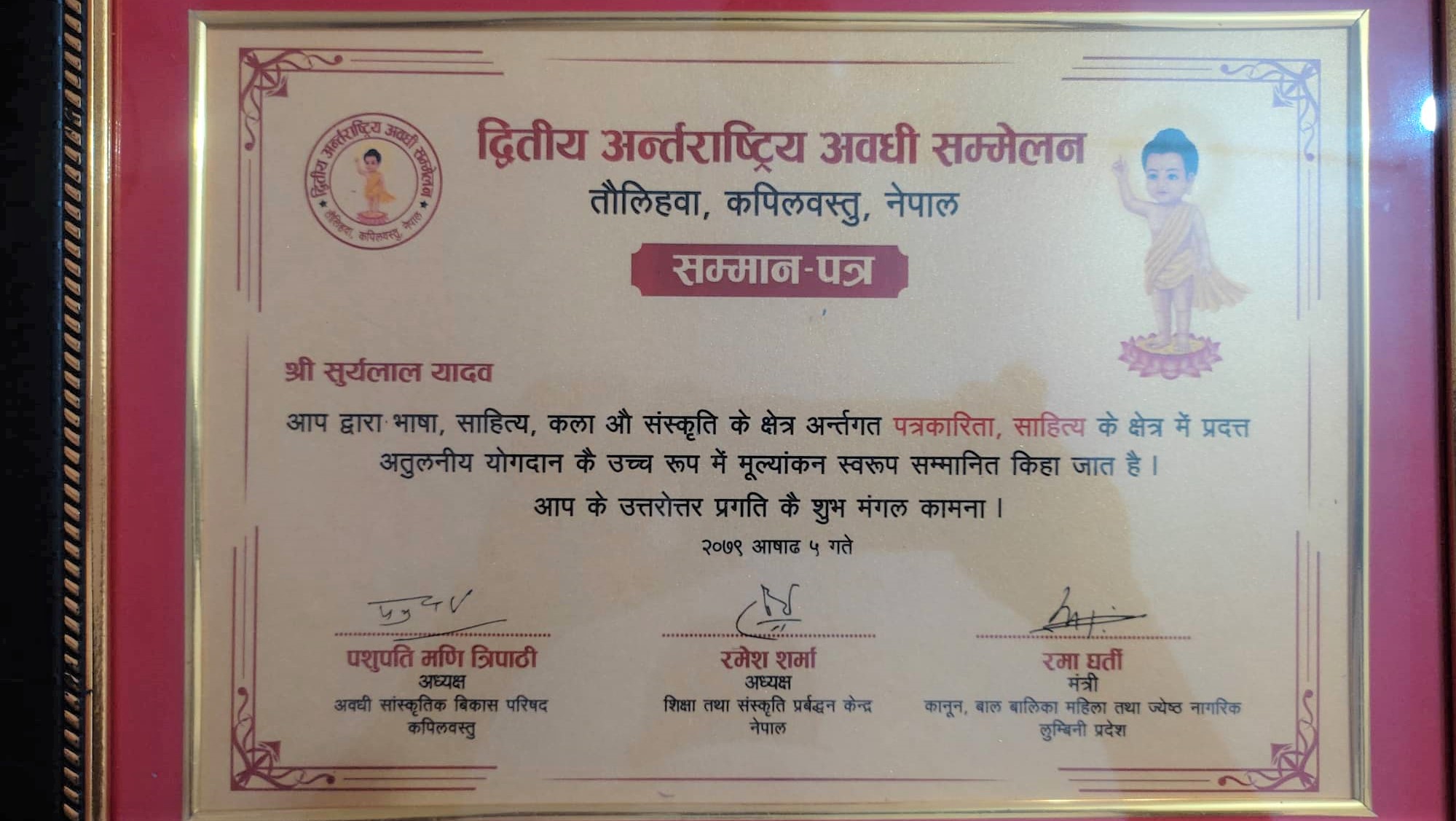 लुम्बिनी प्रदेशको कपिलबस्तुमा सम्पन्न दोस्रो अन्तराष्ट्रिय अवधी सम्मेलनमार्फत यादवले अवधी समुदायको बिकास एवं साहित्य लगायत पत्रकारितामा अतुलनीय योगदान पुर्याएको भन्दै सम्मानित गरिएको हो ।