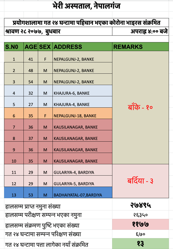 बाँके । बुधबार बाँकेमा १० जना नयाँ संक्रमित फेला परेका छन् । भेरी अस्पताल नेपालगञ्जमा भएको परीक्षणबाट बाँकेका १० सहित १३ जनामा संक्रमण पुष्टि भएको हो ।