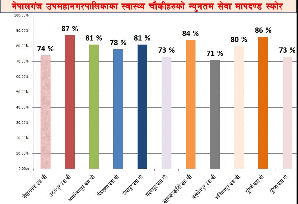 यस्तै खास कारकाँदो स्वास्थ्य चौकीले ८४ प्रतिशत अंक प्राप्त गरेको छ भने जयसपुर र भवानीपुर स्वास्थ्य चौकीले ८१/८१ प्रतिशत अंक प्राप्त गरेको नेपालगञ्ज उपमहानगरपालिका स्वास्थ्य शाखाका हेल्थ असिस्टेन्ट तेज वलीले जानकारी दिनुभयो ।