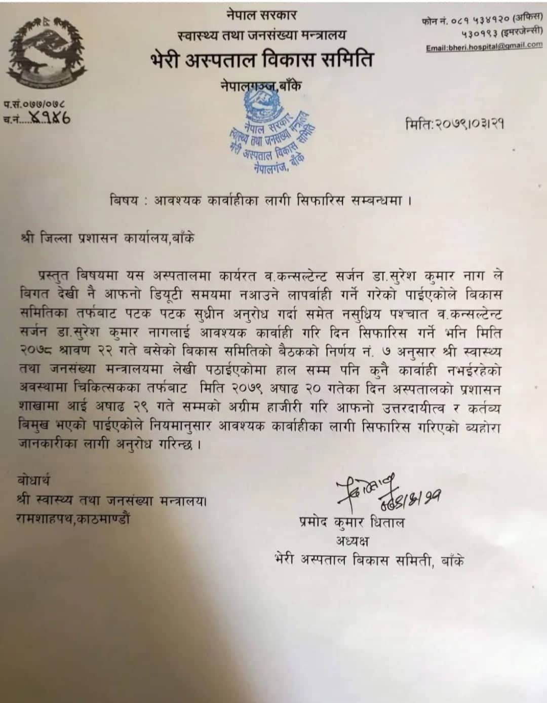 भेरी अस्पतालमा कार्यरत वरिष्ठ कन्सल्टेन्ट सर्जन डा.नागलाई अस्पताल प्रशासनले पटक पटक जिम्मेवारी निर्वाह गर्न अनुरोध गर्दा सुधार नभएपछि कारबाहीका लागि मन्त्रालयलाई पत्र लेखेको हो ।