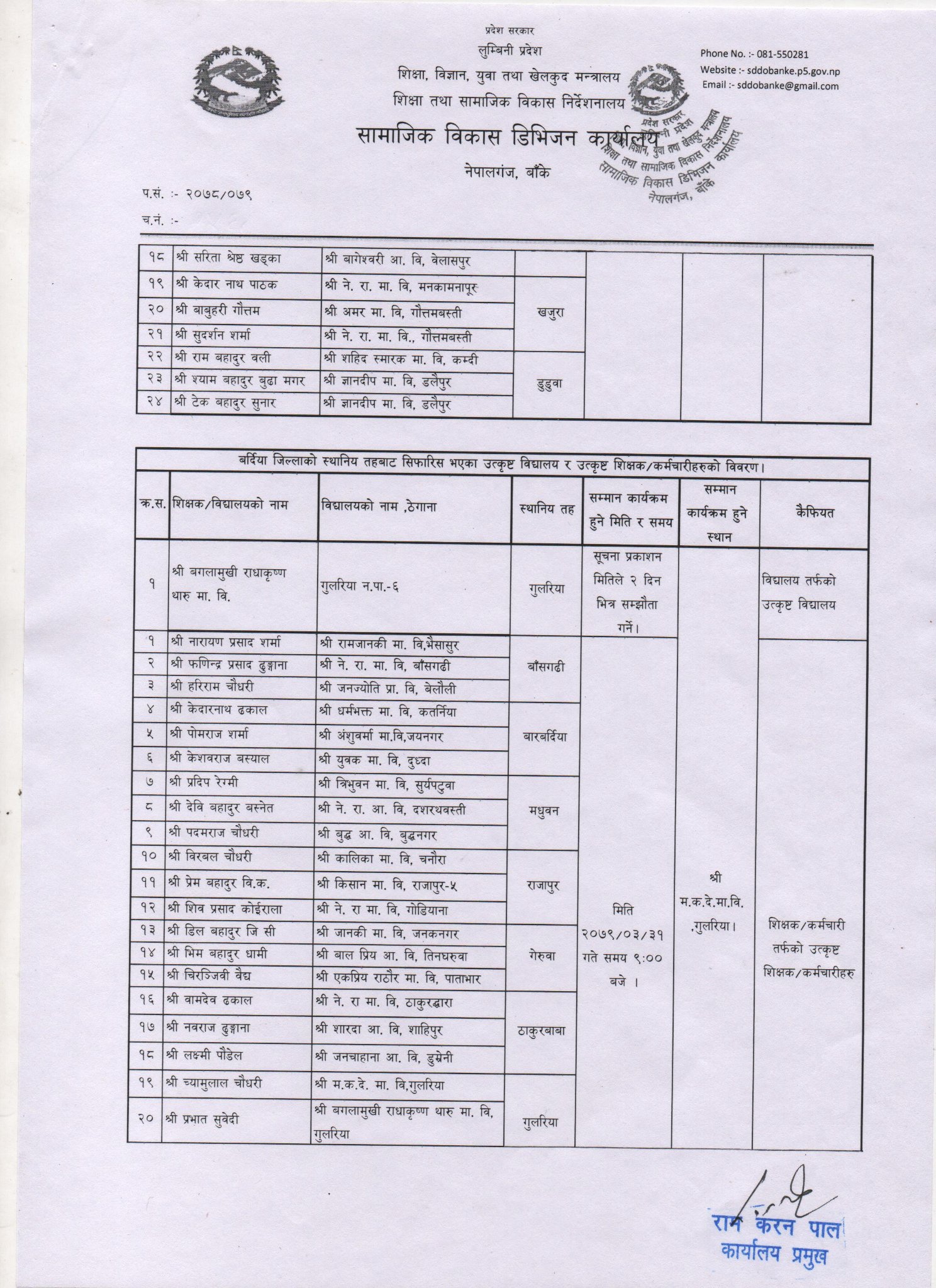 सामाजिक बिकास डिभिजन कार्यालय बाँकेका प्रमुख राम करण पालका अनुसार स्थानीय तहबाट सिफारिस भएर आएका शिक्षकहरुमध्ये २४ जना शिक्षकहरुको नाम छनौट गरिएको हो ।
