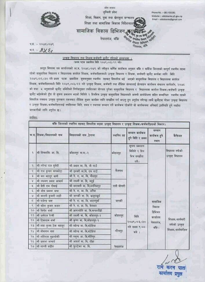 यस्तै कोहलपुर नगरपालिकाको ज्ञानज्योती मा.बि चप्परगौडीका बिनोद शर्मा, लक्ष्मी मा.बि कोहलपुर २ का धर्मराज रेग्मी, र कृष्ण मा.बि कोहलपुर १ का टिकाराम शर्माको नाम छनौटमा परेको छ भने नेपालगञ्ज उपमहानगरपालिकाको आदर्श मा.बि राँझाका प्रकाश आचार्य, फुल्टेक्रा मा.बिका शान्ति कडेंल र बागेश्वरी आ.बि बेलासपुरका सिता श्रेष्ठ खड्का छनौटमा पर्नुभएको हो ।