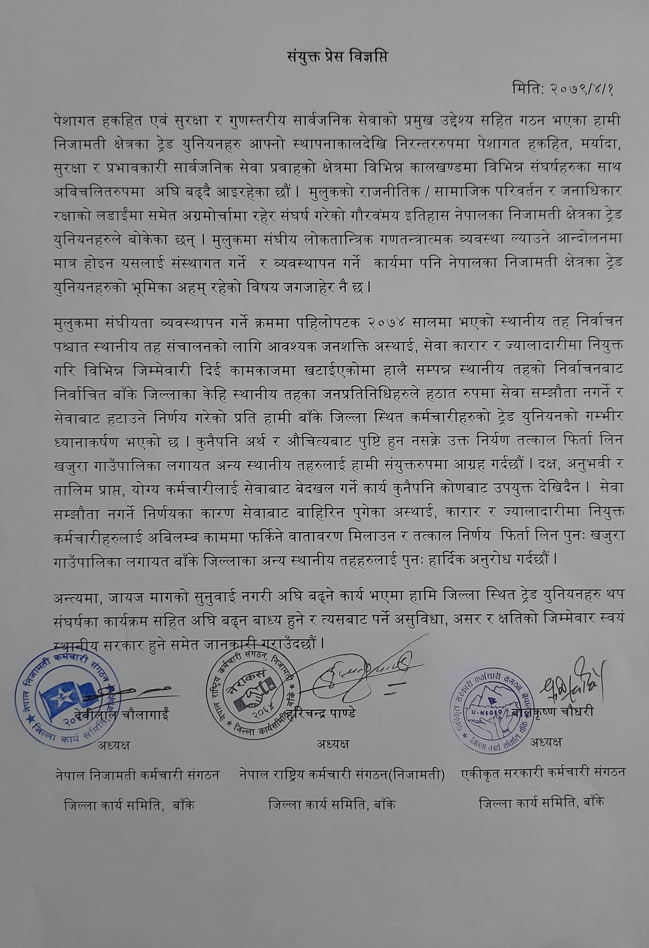 स्थानीय तह संचालनको लागि आवश्यक जनशक्ति अस्थाई, सेवा कारार र ज्यालादारीमा नियुक्त गरि विभिन्न जिम्मेवारी दिई कामकाजमा खटाईएकोमा हालै सम्पन्न स्थानीय तहको निर्वाचनबाट निर्वाचित बाँके जिल्लाका केहि स्थानीय तहका जनप्रतिनिधिहरुले हठात रुपमा सेवा सम्झौता नगर्ने र सेवाबाट हटाउने निर्णय गरेको प्रति निजामती क्षेत्रका ट्रेड युनियनहरुको ध्यानाकर्षण भएको जनाएको हो ।