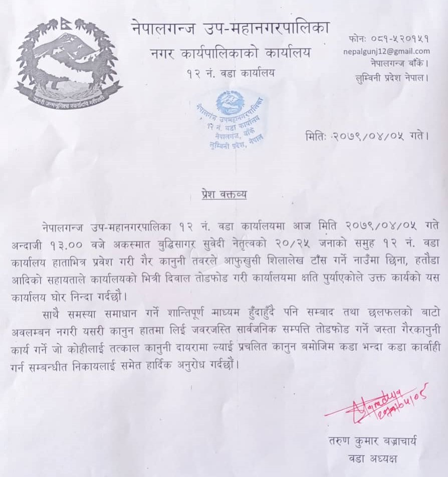 नेपालगञ्ज । नेपालगञ्ज उपमहानगरपालिका वडा नम्बर १२ वडा कार्यालयमा शिलालेख राख्ने विषयमा विवाद भएको छ ।