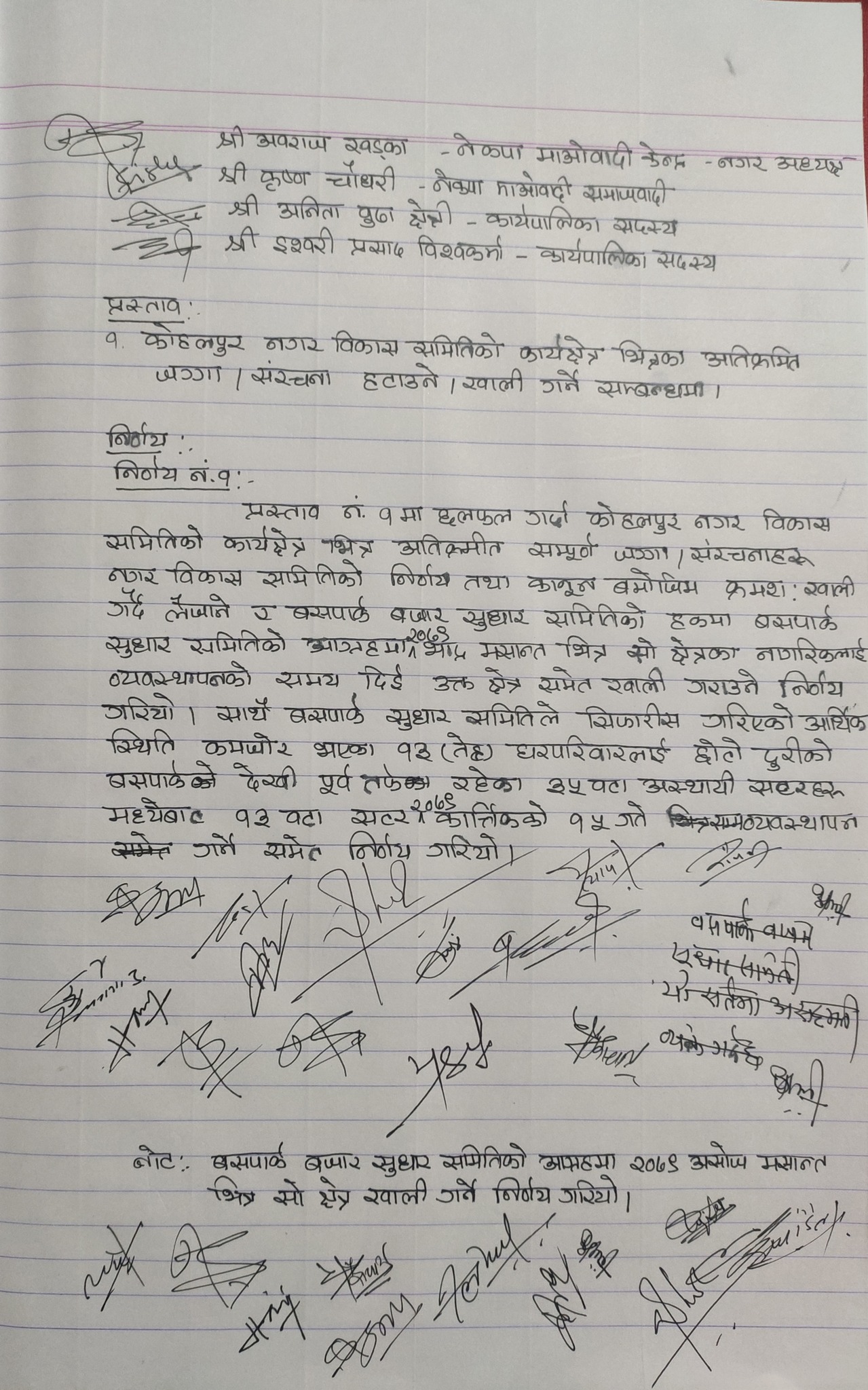 सर्वदलीय तथा सर्वपक्षीय बैठकमा असोज मसान्तभित्र नगर बिकास समितिभित्रका संरचना खाली गर्न बसपार्क सुधार समिति समेत सहमत भएपछि अतिक्रमित संरचना हटाउने बर्षौंदेखिको प्रयास सफल हुने भएको नगर प्रमुख पूर्ण प्रसाद आचार्यले बताउनुभयो ।