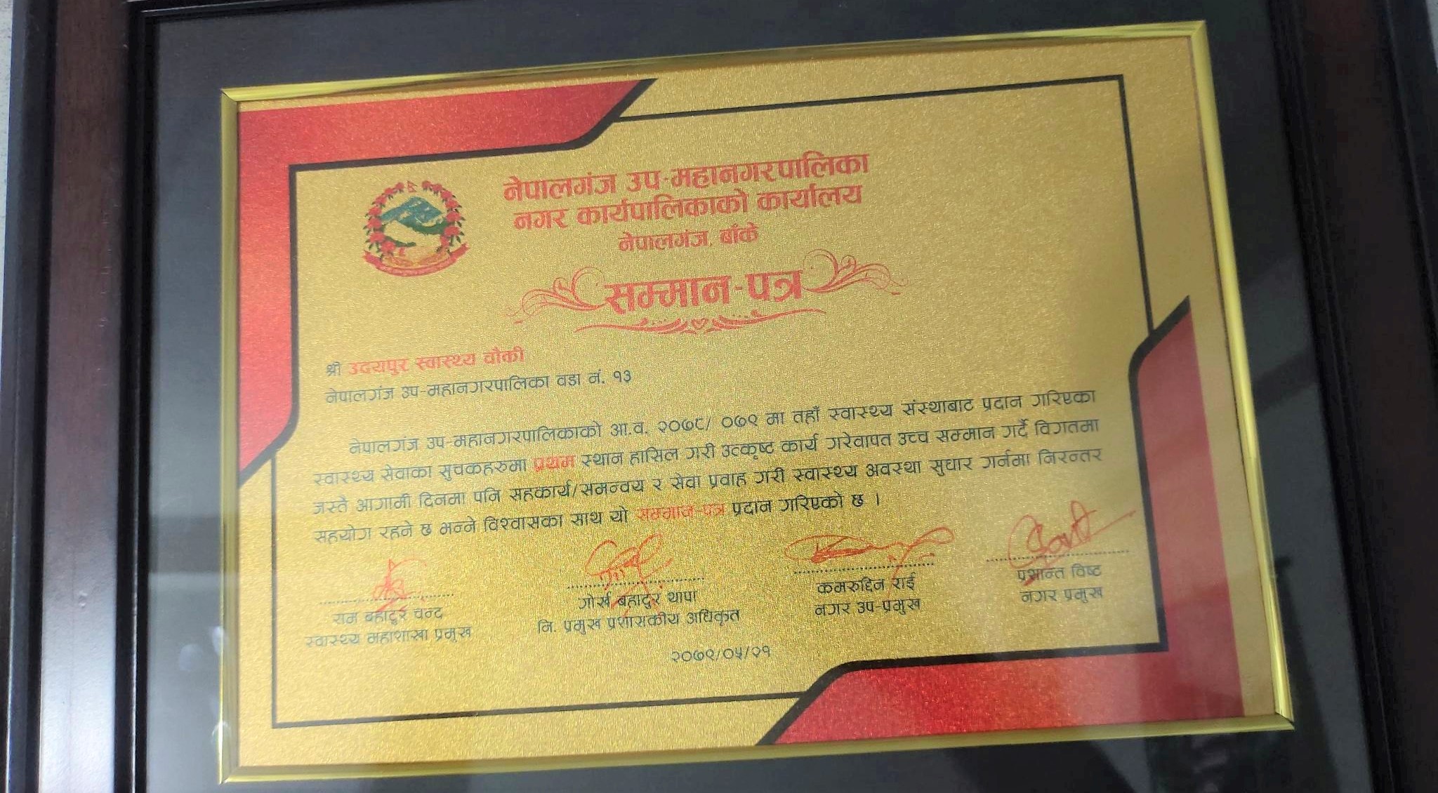 नेपालगञ्ज । नेपालगञ्ज उपमहानगरपालिकाले गत आर्थिक वर्ष २०७८/७९ मा उत्कृष्ट स्वास्थ्य सेवा प्रवाह गरि गुणस्तरीय सेवा प्रदान गरे बापत उत्कृष्ट स्वास्थ्य सस्थालाई सम्मान गरेको छ ।