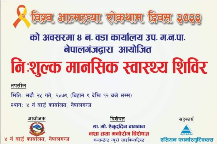 त्यसका लागि वडा कार्यालयले बिश्व आत्महत्या राेकथाम दिवस -२०२२ काे अवसरमा २५ गते शनिबार स्वास्थ्य शिबिरकाे आयाेजना गरेकाे छ । बिहान ९ बजेदेखि शिबिर संचालन हुनेछ ।