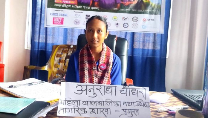 बालिका दिवसको अवसरमा आज मधुवन नगरपालिकाका महिला, बालबालिका तथा जेष्ठ नागरिक शाखाका प्रमुखको पद आज मधुवन नगरपालिका वडा नंं ५ का सिओसी कक्षाको १७ बर्षीय अनुराधा चौधरीले सम्हाल्नुभएको छ ।