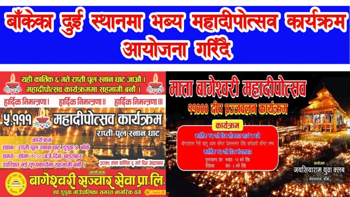 महादीपोत्सव कार्यक्रम अन्तर्गत आज अर्थात कार्तिक ५ गते शनिबारका दिन नेपालगञ्जस्थित माता बागेश्वरीमा महादीपोत्सव कार्यक्रम आयोजना गरिएको र भोलि अर्थात ६ गते आइतबारका दिन बाँकेको सिधनियास्थित रहेको स्नान घाटमा महादीपोत्सव कार्यक्रम आयोजना गरिएको हो ।