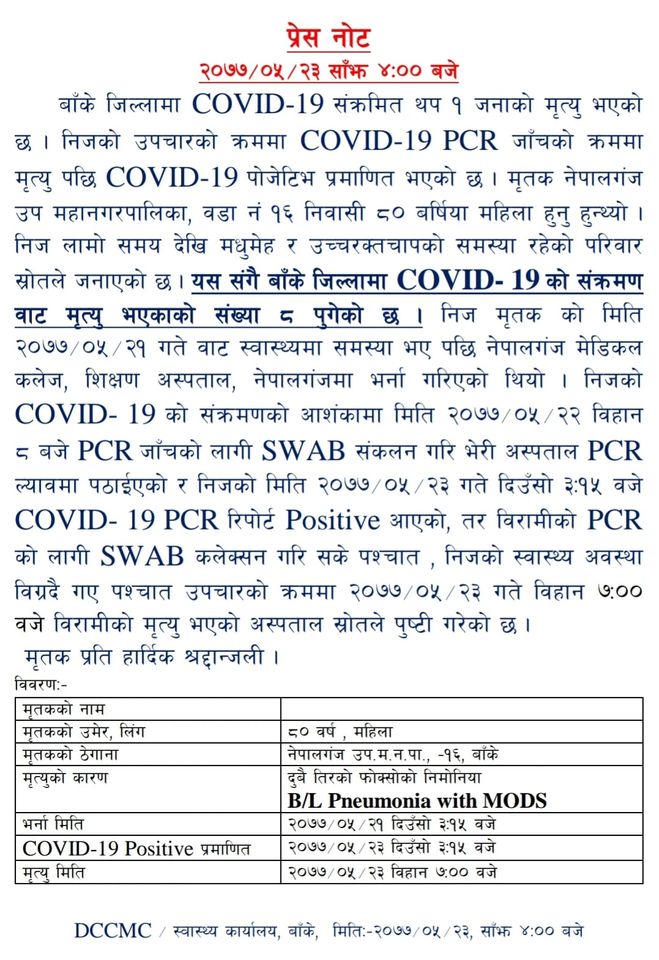 नेपालगञ्ज–१६ का उनको मृत्यु भएपछि पिसिआर परीक्षण रिर्पोट पोजेटिभ देखिएको बाँकेका कोरोना फोकल पर्सन नरेश श्रेष्ठले जानकारी दिनुभयो ।