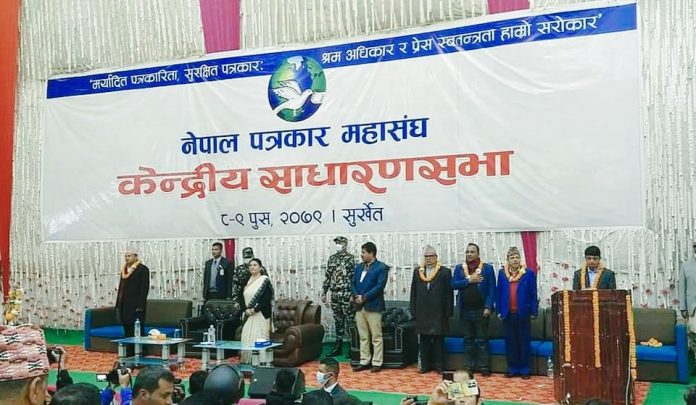 सुर्खेत । कर्णाली प्रदेशको राजधानी वीरेन्द्रनगरमा २०७९ पुस ८-९ गते सम्पन्न नेपाल पत्रकार महासंघको केन्द्रीय साधारणसभा महासचिव, कोषाध्यक्ष र लेखा समिति संयोजकको प्रतिवेदन पारित गर्दै यो घोषणा जारी गर्दछ ।