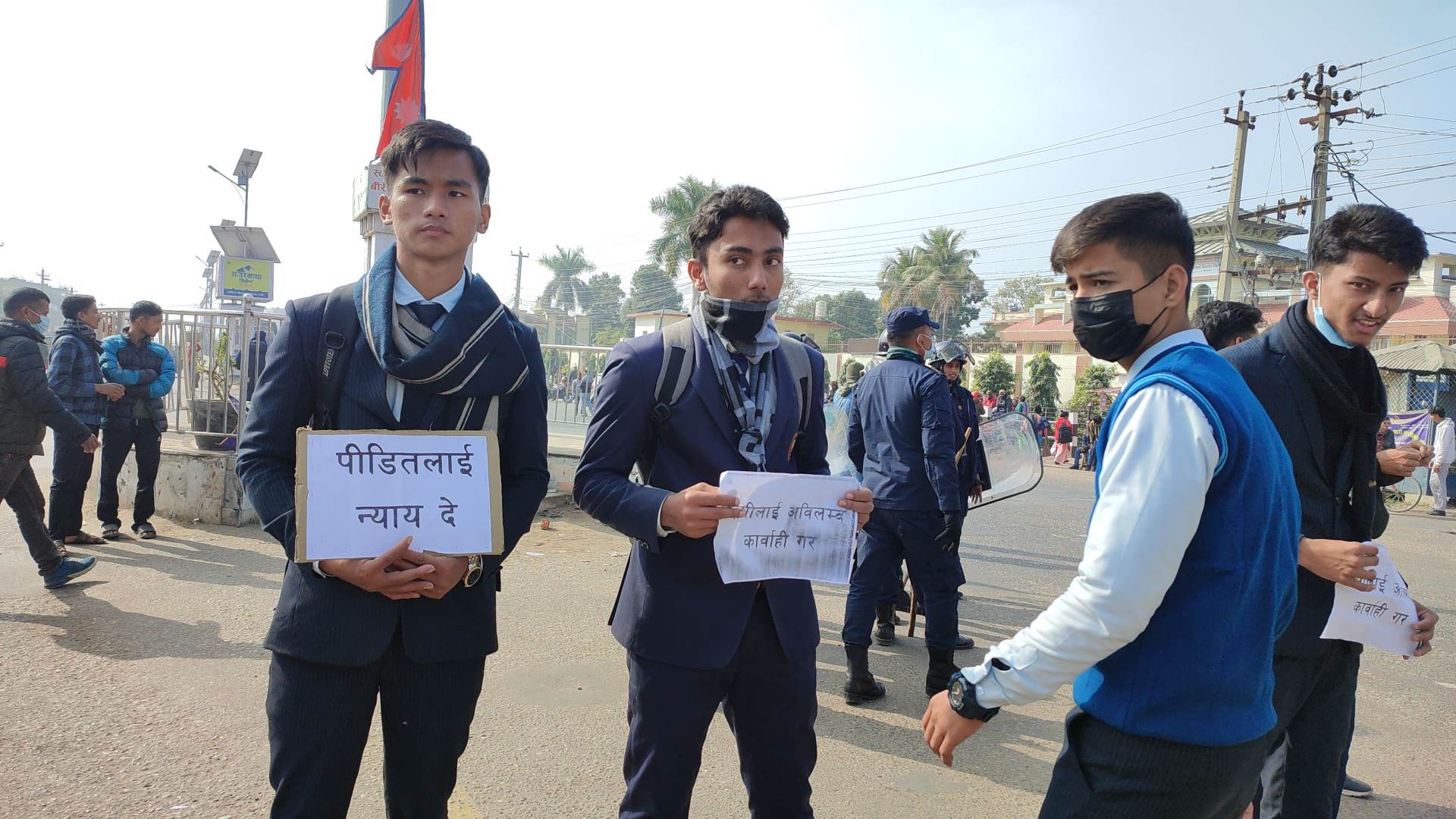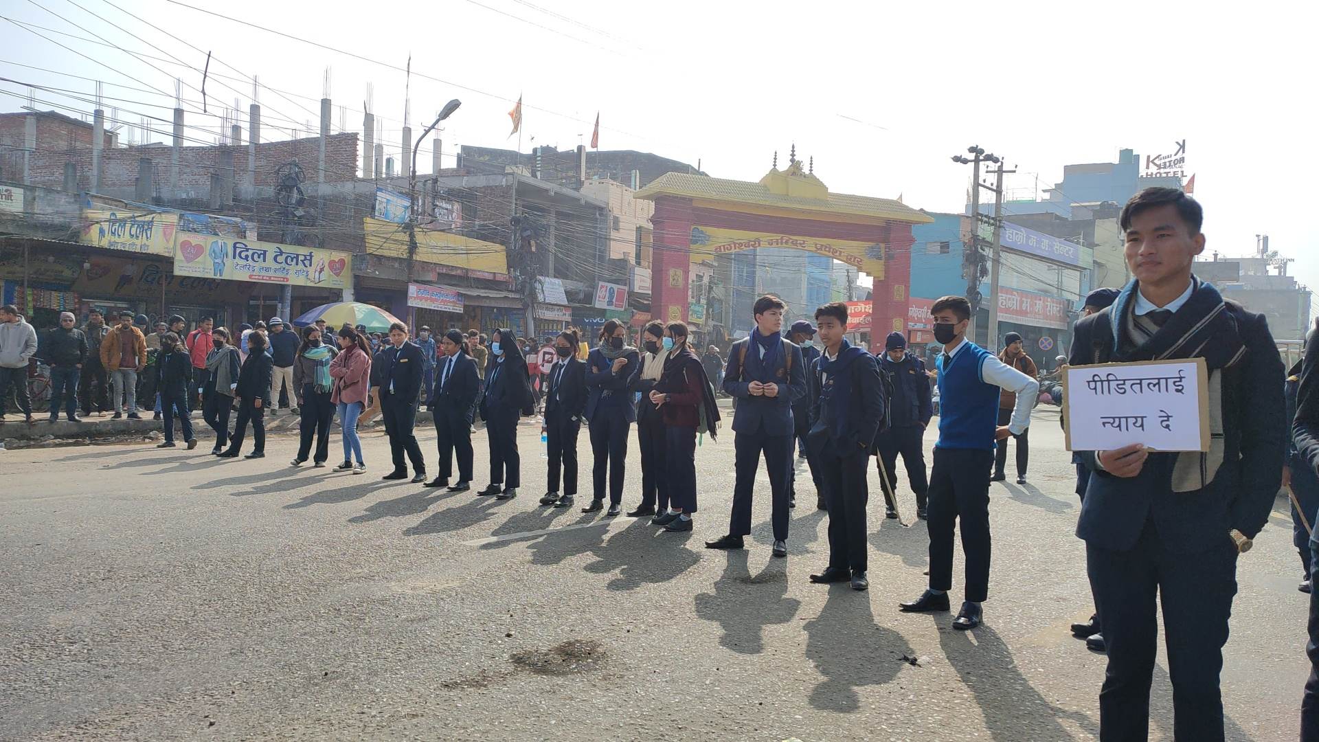 नेपालगञ्ज । पिडितलाई न्यायको माग गर्दै नेपालगञ्ज बजारका मुख्य मुख्य चोक चोकमा प्रदर्शन गरिएको छ । घट्नाको दुई बित्दा पनि पिडक कारबाहीको दायरामा नआएको भन्दै बाँकेका बिभिन्न बिद्यालयका बिद्यार्थी तथा पिडितका आफन्तहरुले नेपालगञ्ज बजारको मुख्य मुख्य चोकमा प्रदर्शन गरेका छन् ।