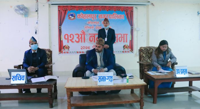 कोहलपुर । कोहलपुर नगरपालिकाको १२ औं नगरसभा आजदेखि सुरु भएको छ । उक्त नगरसभामा नगर प्रमुख पूर्ण प्रसाद आचार्यले अर्को बैठक बस्नु पूर्व सबै सभाषद समक्ष पुग्ने गरी चार वटा प्रस्ताव प्रस्तुत गर्नुभएको छ ।