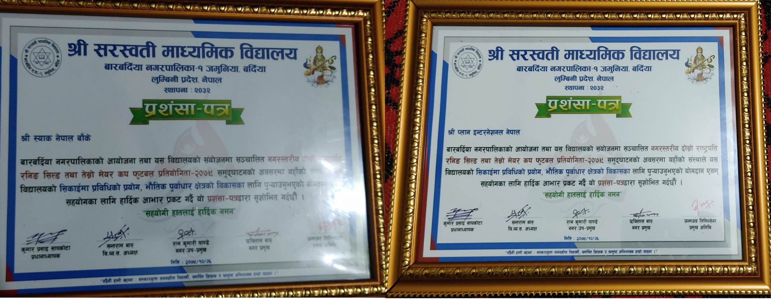 सरस्वती माध्यमिक बिद्यालय बारबर्दिया १ जमुनियाको संयोजनमा शुरु भएको प्रतियोगितामा लामो समयदेखि प्लान इन्टरेशनल नेपाल तथा सामाजिक सचेतन सरोकार मंच (स्याक नेपाल) बाँकेलाई पालिकास्तरको शैक्षिक गुणस्तर बृद्दि गर्न पालिकास्तरको शिक्षा योजना, शिक्षा नीति, स्थानीय पाठ्यक्रम निर्माण र भौतिक क्षेत्रको बिकासका लागि टेवा पुर्याएको भन्दै लुम्बिनी प्रदेश सभा सदस्य जन्मजय तिमिल्सेना, बारबर्दिया नगरपालिकाका नगर प्रमुख छविलाल थारु तथा नगर उपप्रमुख रत्न कुमारी पाण्डेले संयुक्त रुपमा दुबै संस्थालाई सम्मान पत्रले सम्मान प्रदान गर्नुभएको थियो ।