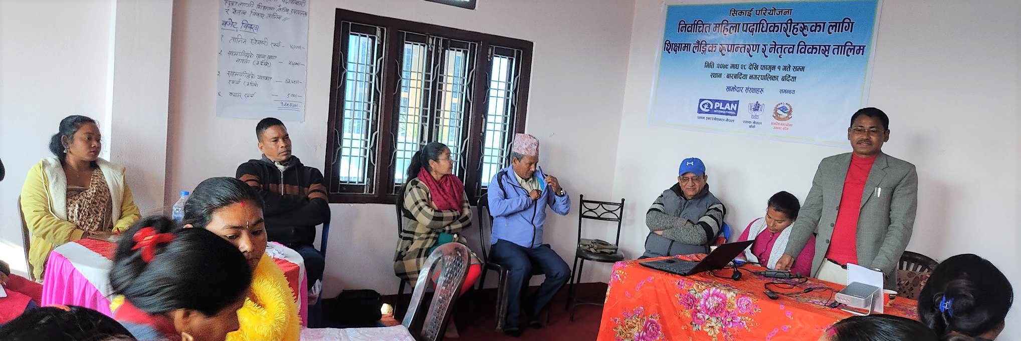 बारबर्दिया । निर्वाचित महिला पदाधिकारीहरुका लागि शिक्षामा लैङ्गिक रुपान्तरण तथा नेतृत्व बिकास सम्बन्धि तीन दिने तालिम बारबर्दियाको जयनगरमा शनिबारबाट शुरु भएको छ ।