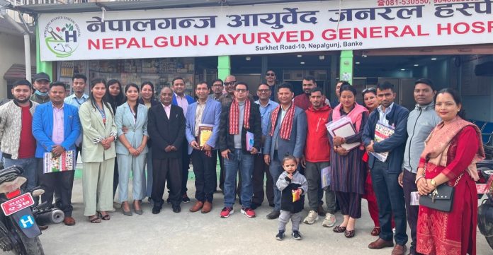 शनिबार अस्पताल परिसरमा नेपालगन्ज आयुर्वेद जनरल हस्पिटलले नेपाल आयुर्वेद औषधी व्यवसायी संघ तथा नेपाल आयुर्वेद स्वास्थ्यकर्मी समाजको पाँचौं महाधिवेशन÷राष्ट्रिय अधिवेशनबाट केन्द्रिय कार्यसमितिमा चयन भएका आयुर्वेद औषधी व्यवसायी र स्वास्थ्यकर्मीलाई सम्मान गरेको हो ।