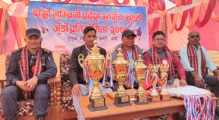 नेपालगञ्ज । बाँकेको डुडुवा गाउँपालिकामा आजदेखि दोस्रो लुम्बिनी प्रदेशस्तरीय खुल्ला जुडो प्रतियोगिता शुरु भएको छ । डुडुवा गाउँपालिकाकाको समन्वयमा शहिद स्मारक माबिको प्रांगणमा कम्दी जुडो डोजो क्लबको आयोजनामा उक्त प्रतियोगिता शुरु भएको हो ।