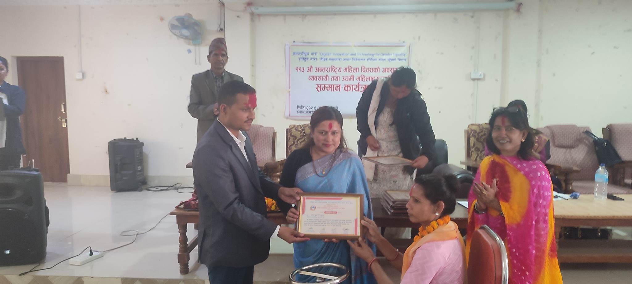 काेहलपुर । कोहलपुर नगरपालिकाले ११३ औं अन्तरास्ट्रिय महिला दिवसको अवसरमा व्यवसायी तथा उधमी महिलालाई सम्मान गरेको छ ।