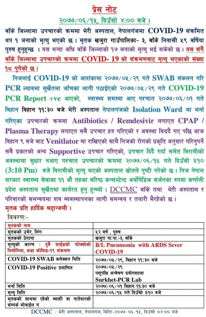 रेमडिसिभिर औषधिसँगै उनलाई दुईपटक प्लाज्मा थेरापीबाट पनि उपचार गरिएको थियो । यसअघि नेपालगञ्ज मेडिकल कलेज कोहलपुरमा नेपालगञ्ज–४ का ५२ वर्षका एक पुरुष र सुर्खेतकी एक ७५ वर्षीया महिलाको उपचारका क्रममा मृत्यु भएको हो ।