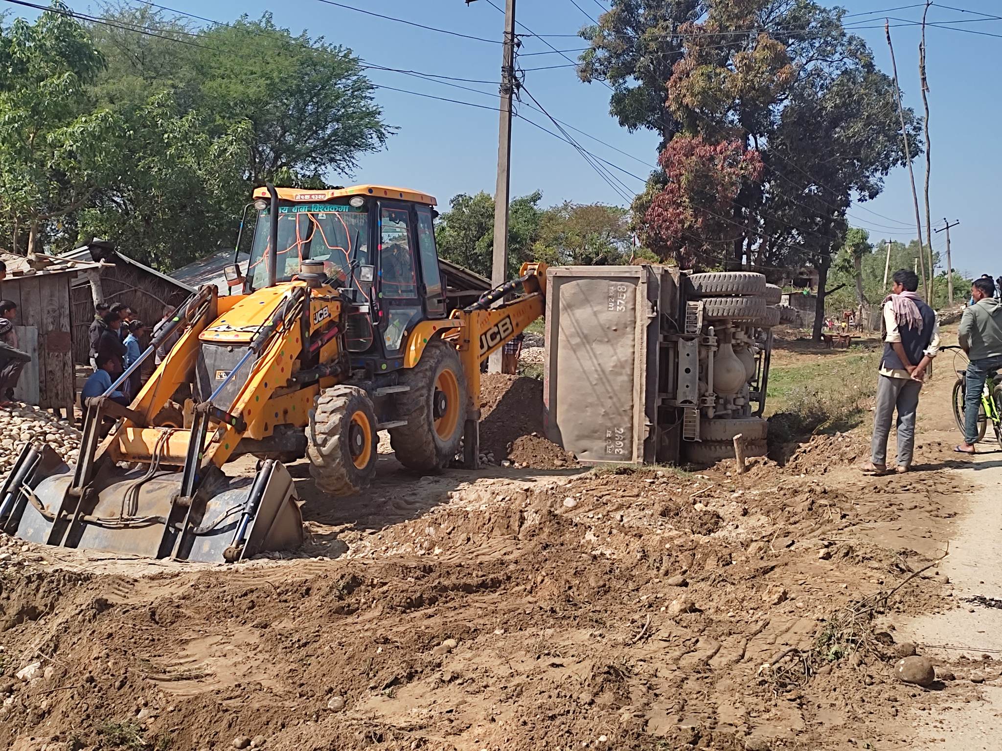 ग्राविल लोड गरेर राप्ती नदिदेखि नेपालगन्जतर्फ आउँदै गरेको लु २ ख ३७५८ नम्बरको टिप्पर बुधवार बिहान डुडुवा पुलस्थित श्याम आयल स्टोर नजिकै दुर्घटनामा परेको हो ।