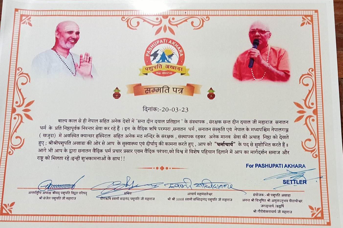 सम्मान पत्रमा पशुपति अखाडाका संयोजक अनन्तश्री विभूषित श्री अर्मतानुभव पीठाधिश्वर जगताचार्य व्रम्हर्षि श्री गौरी शंकाराचार्य महाराज, आचार्य महामण्डलेश्वर श्री १००८ श्री सच्चिदानन्द पशुपतिजी महाराज, अखडाका सचिव योगऋषि स्वामी श्री सदानन्द पशुपतिजी महाराज र श्रीमद् पशुपति विद्वत् परिषद्का अन्तर्राष्ट्रिय अध्यक्ष श्री सञ्जेल पशुपतिजी महाराजले हस्ताक्षर गर्नुभएको छ ।