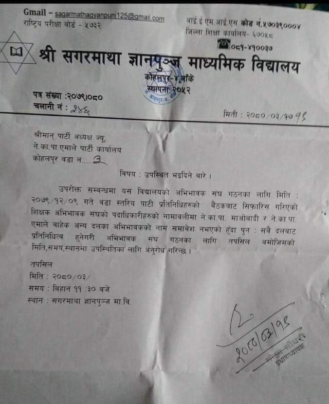 प्रधानाध्यापकले राजनीतिक दललाई लेखेको पत्र नै चर्चाको कारण रहेको छ । विद्यालयका प्रधानाध्यापकले पार्टी प्रतिनिधिहरुलाई लेखेको पत्रमा पहिला नै गठन गरिएको शिक्षक अभिभावक संघमा ने.क.पा. एमाले तथा माओवादीको मात्र प्रतिनिधि समावेश भएको र अन्य पार्टीका प्रतिनिधि नभएकोले अन्य पार्टीलाई समेत समावेश गर्न संघ पुर्न गठनका लागि पत्र पठाइएको छ ।