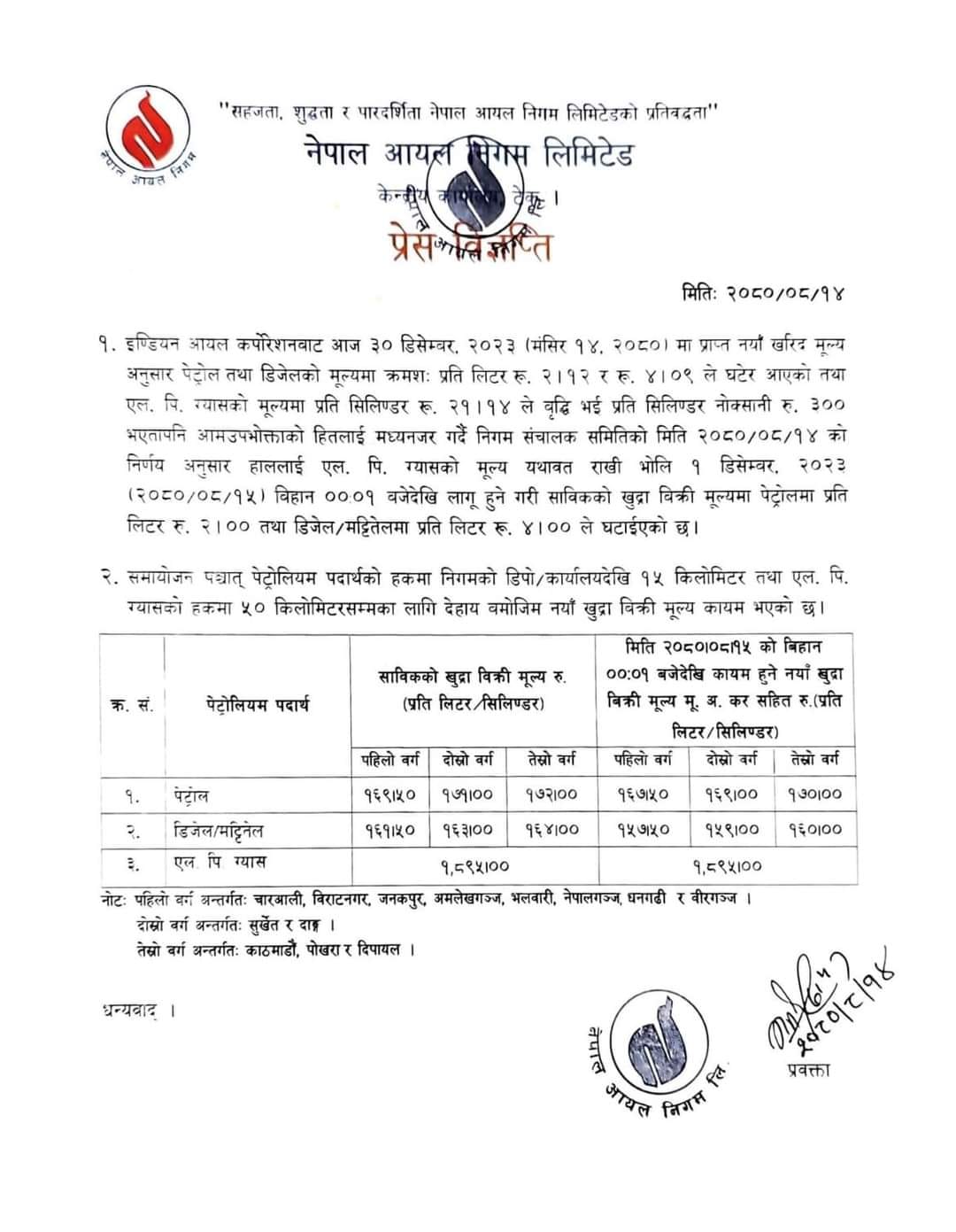 सुर्खेत र दाङ क्षेत्रमा १६९ रुपैयाँ तथा काठमाडौं, पोखरा र दिपालय डिपोको १५ किलोमिटर क्षेत्रमा एक लिटर पेट्रोलका लागि १७० रुपैयाँ पर्ने छ ।