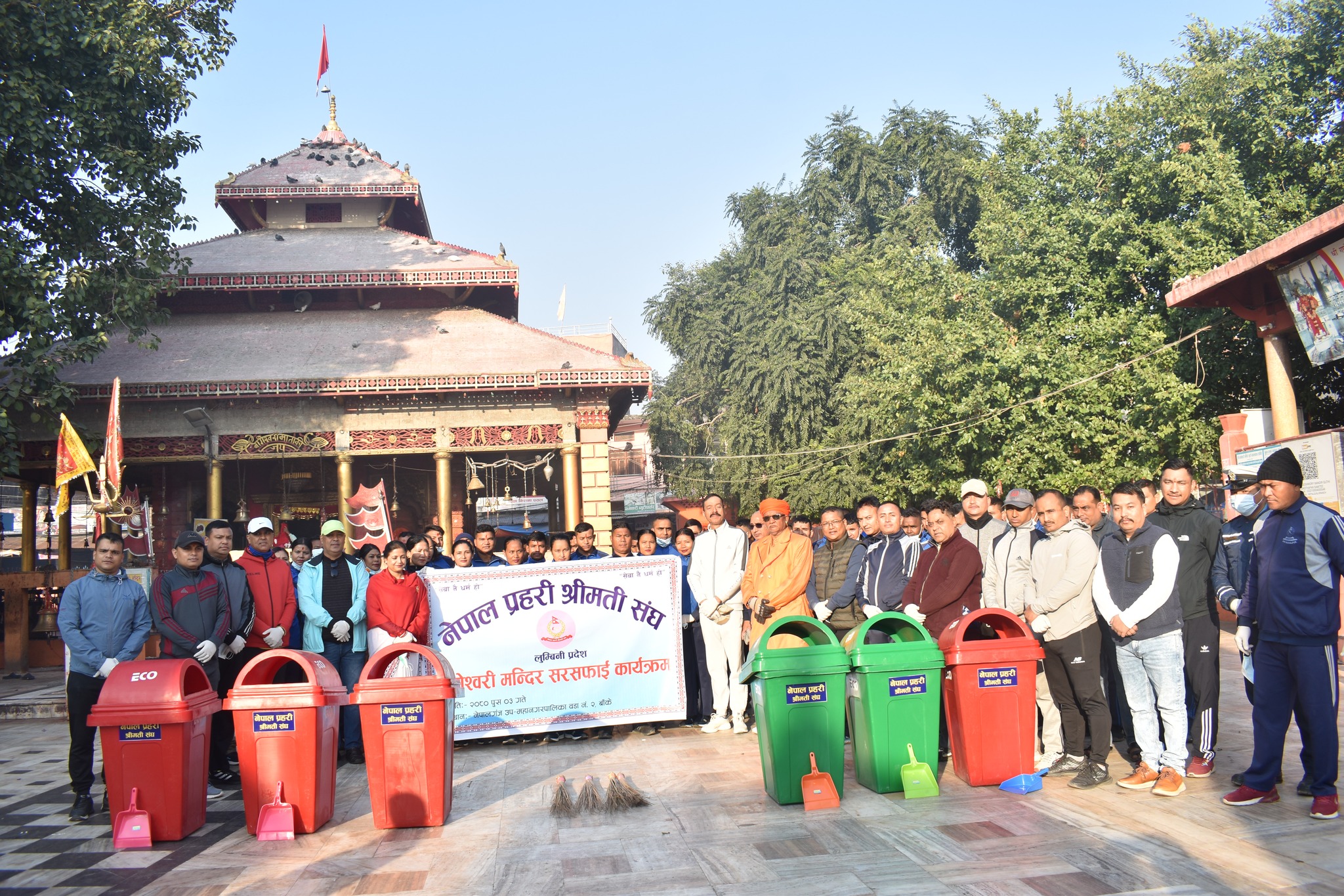 नेपाल प्रहरी श्रीमती संघ लुम्बिनी प्रदेशको आयोजनामा मंगलबार बिहान मन्दिर क्षेत्रको सरसफाई गर्दै डस्टविन समेत हस्तान्तरण गरिएको हो ।
