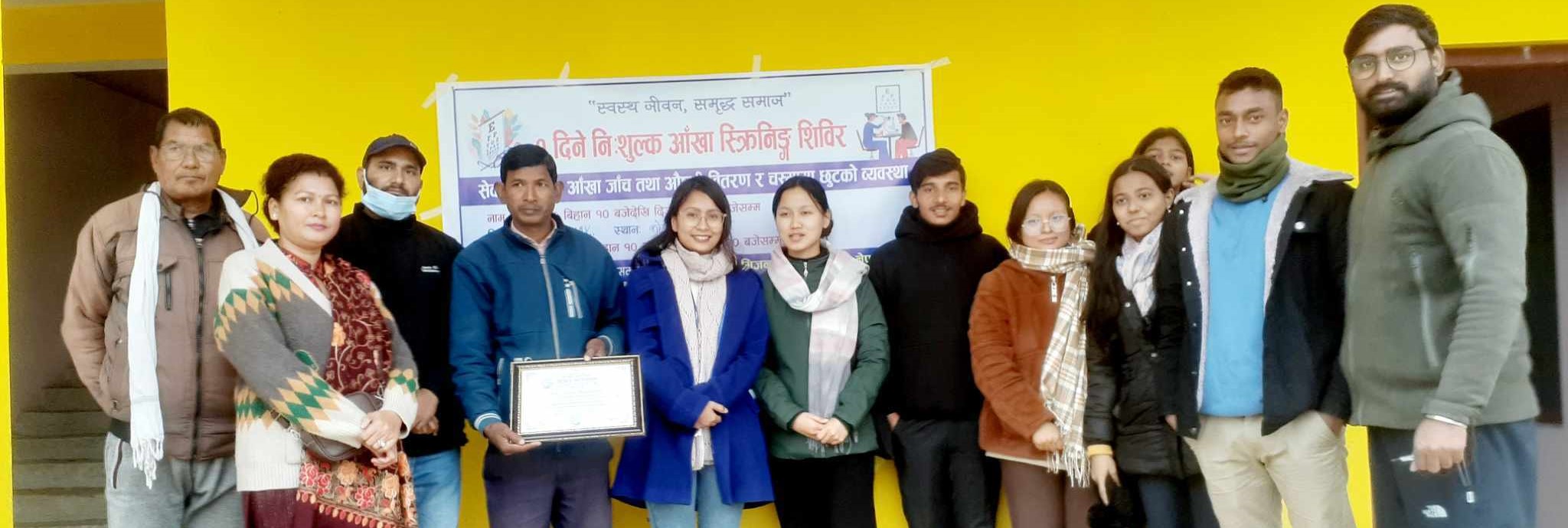 स्वस्थ जीवन, समृद्ध समाज भन्ने मुल नाराका साथ सम्पन्न शिबिरमार्फत चस्मा आवशयक भएकालाई छुट दरमा प्रदान गरिएको थियो । साथै सेवाग्राहीलाई निःशुल्क औषधी समेत बितरण गरिएको छ । शिविरमा १५ जना स्थानीयमा मोतिबिन्दुको समस्या देखा परेको छ । १६ जनालाई चस्मा प्रदान गरिएको थियो ।