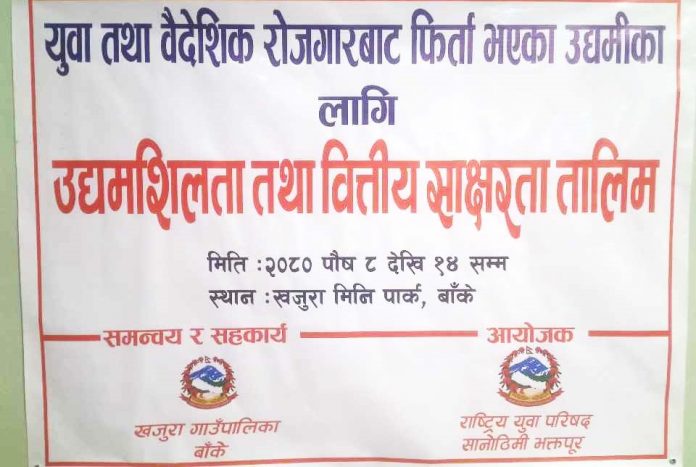 हरि अधिकारी, खजुरा । बाँकेको खजुरामा संचालित उद्यमशीलता तथा बित्तीय साक्षरता सम्बन्धि एक हप्ते तालिम शनिबार समापन भएको छ ।