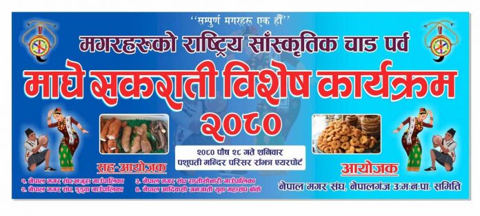 नेपाल मगर संघ नेपालगन्ज उपमहानगरपालिकाको आयोजना र सह आयोजनामा नेपाल मगर संघ खजुरा गाउँपालिका, नेपाल मगर संघ डुडुवा गाउँपालिका, नेपाल मगर संघ राप्ती सोनारी गाउँपालिका र नेपाल जनजाति युवा महासंघ बाँकेको सहकार्यमा आफ्नो प्रमुख पर्वका अवसरमा पुस २८ गते शनिवार राँझा एयरपोर्ट पशुपति मन्दिर परिसरमा माघे सकराती भव्य रुपमा मनाउने तयारी गरिएको हाे ।