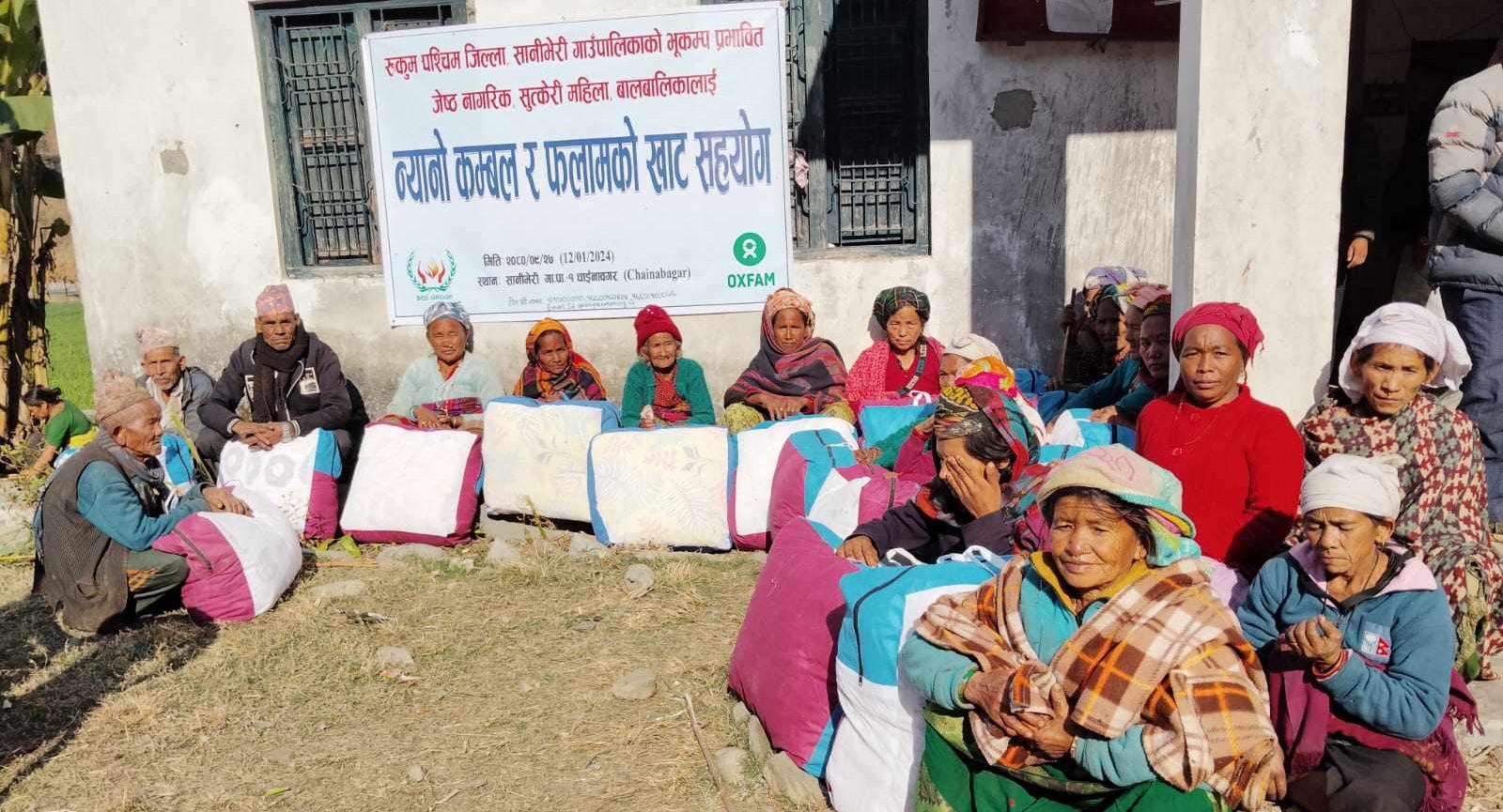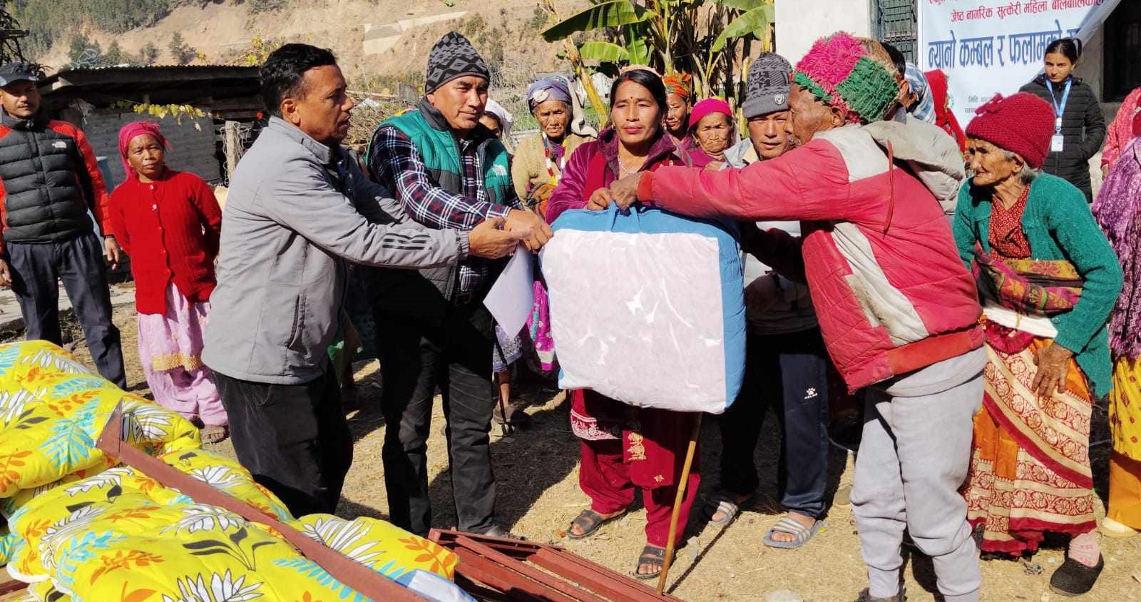 भुकम्पले घर भत्काएपछि त्रिपालमुनी भूईंमा विस्तरा लगाएर सुत्न वाध्य जेष्ठ नागरिक, सुत्केरी, बालबालिका र दीर्घरोगीलाई बढ्दै गरेको चिसोले स्वास्थ्यमा नकारात्मक असर गरिरहेको कुरालाई मध्यनजर गरी चिसोबाट बच्नका लागि सहयोग पु¥याउने ध्ययले संस्थाले अक्सफाम नेपालसँग साझेदारी गरी प्रति घरधुरी करिब रु ६ हजार नौ सय मूल्य बराबरको न्याने कम्बल र खाट सहयोग गरेको संस्थाका कार्यकारी निर्देशक डम्मर सुनारले जानकारी दिनुभयो