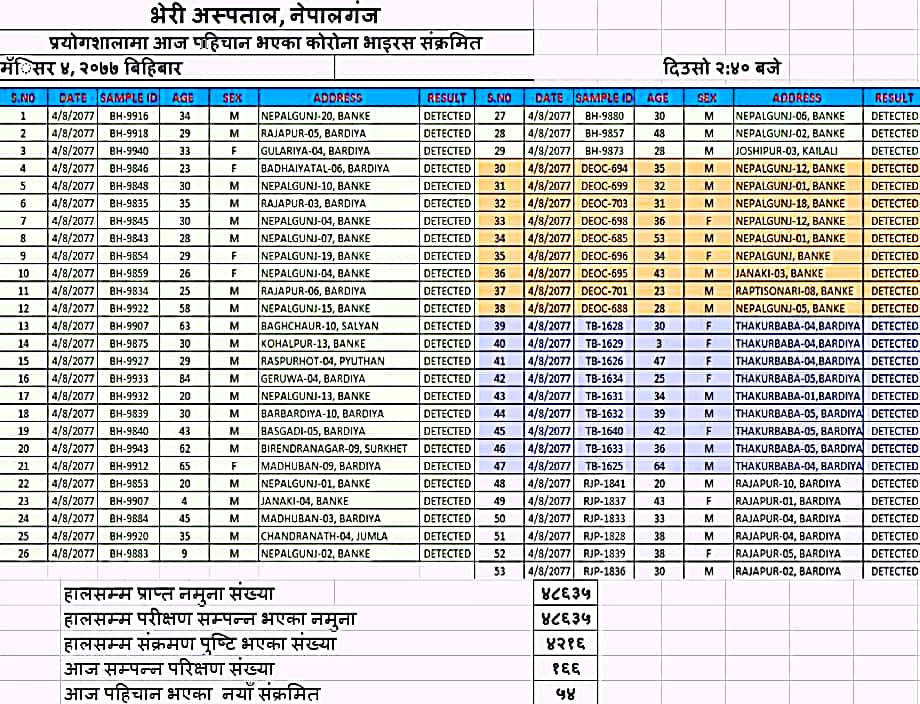 परीक्षण नतिजा अनुसार बाँकेका २४ जना, बर्दिया ठाकुरबाबाका ९ जना, बर्दियाकै राजापुरका ९ जना, मधुवन, बारबर्दिया, सुर्खेत, जुम्ला कैलाली लगायत जिल्लाका व्यक्तिहरूमा संक्रमण देखिएकाे छ ।