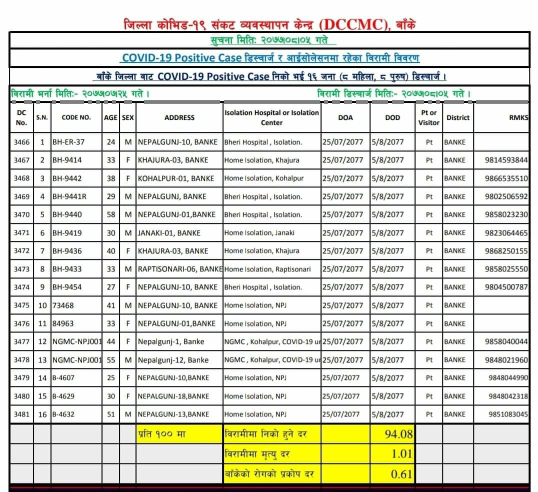 बाँकेका काेराेना फाेकल पर्सन नरेश श्रेष्ठका अनुसार प्रति १०० बिरामीहरूमा ९४.०८ प्रतिशत बिरामी निकाे हुने दर रहेेकाे छ ।