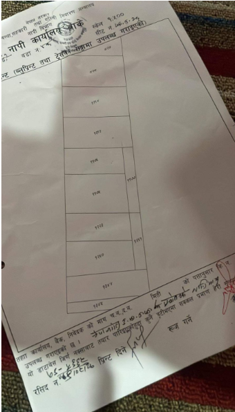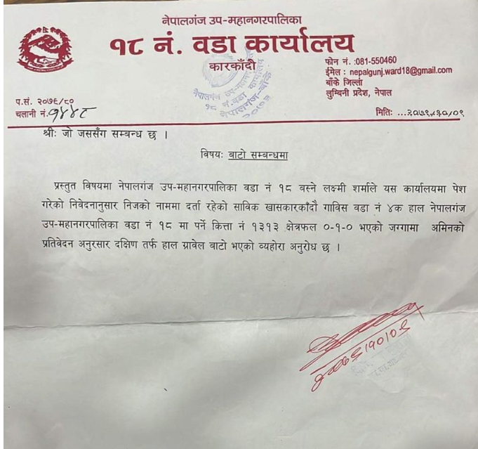 प्लटिङ गर्ने क्रममा चार मिटरको बाटो भने नेपालले आफनो नाममा गरेका छन् । प्लटिङ गरेको क्षेत्रमा चार मिटरको बाटो छ । कित्ता नम्बर ११७७ र १२६१ नम्बर बाटोको लागि छुटयाइएको छ । त्यही बाटो अवरुद्ध गरिएको छ ।